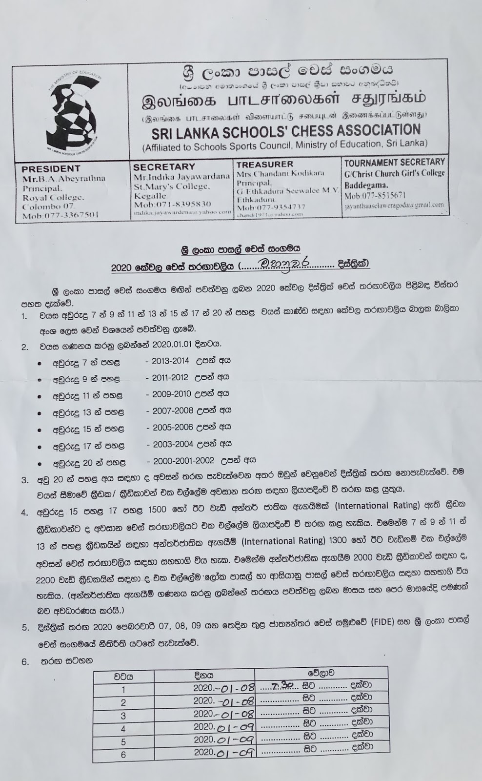Sri Lanka Schools Chess Association Calendar Year Plan 2020