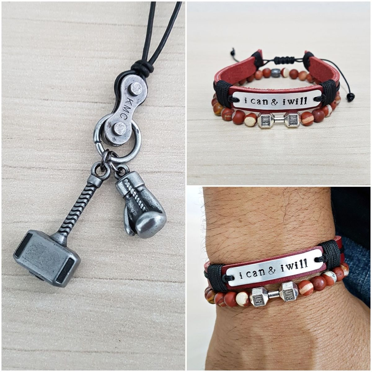 Kit 3 Pulseiras Couro E 1 Colar Masculino Luva Boxe Pulseiras Masculinas Pulseira Masculina Couro Acessorios Masculinos