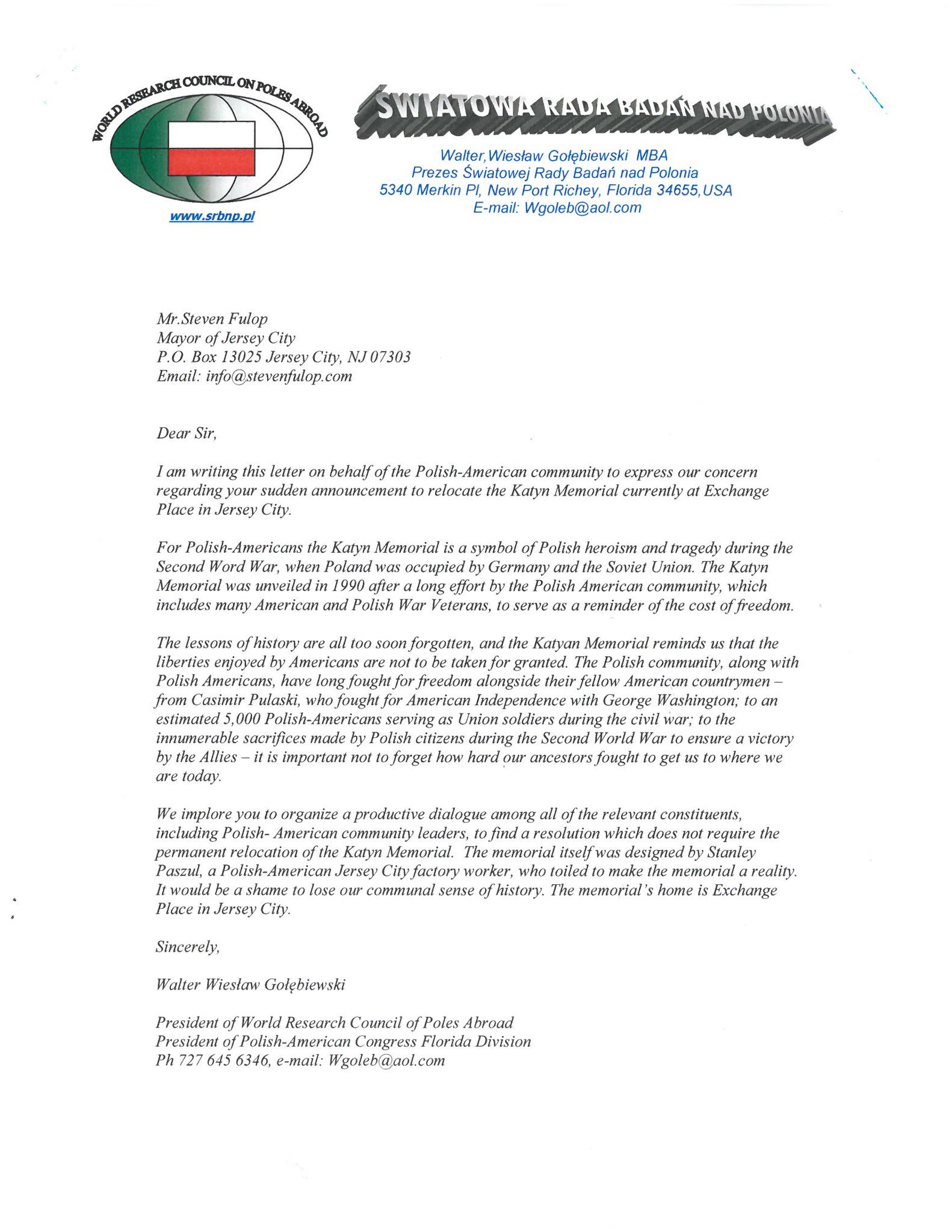 Polish Consulate Nyc Pa Twitter A Letter To The Mayor Of Jersey City From World Research Council Of Poles Abroad Pointing The Katyn Monument In Jc Does Not Merely Stand For