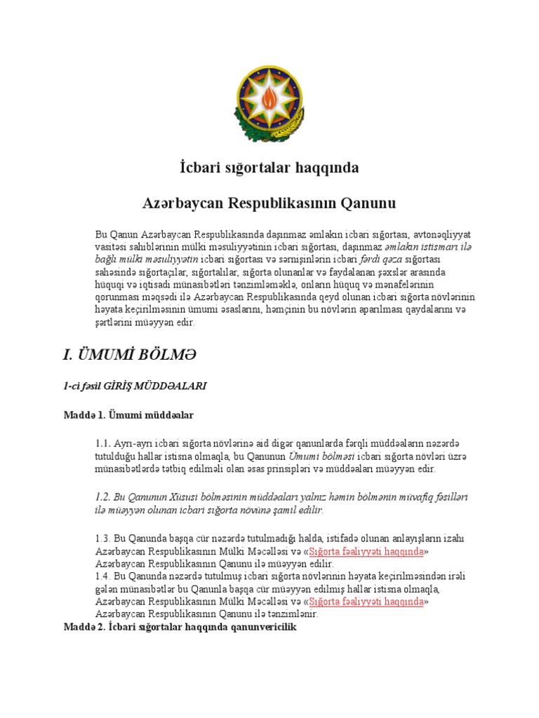 Https Www Kasko Az Uploads Icbrai Sigortalar Haqqinda Azerbaycan Respublikasinin Qanunu Pdf