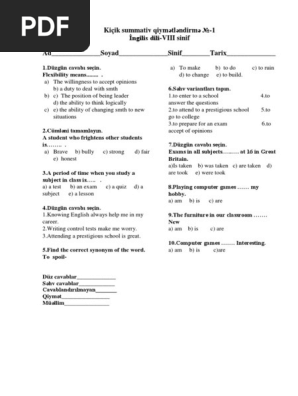 8 Ci Sinif Ingilis Dili Ksq Testləri Azehub